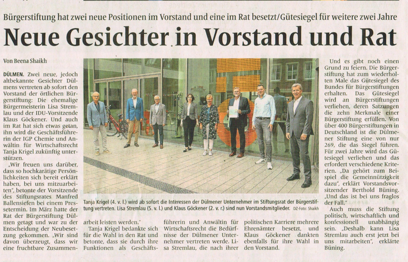 Bei dieser Gelegenheit wurde auch bekanntgegeben, dass der Bürgerstiftung Dülmen erneut ein Gütesiegel zuerkannt wurde, das vom Bündnis der Bürgerstiftungen in Deutschland für jeweils zwei Jahre verliehen wird. Strenge Auswahlkriterien sorgen dafür, dass die Qualität der Arbeit der beteiligten Bürgerstiftungen überwacht und anerkannt wird. Die Bürgerstiftungen müssen nachweisen, dass sie alle 10 Punkte der Gütesiegel-Anforderungen erfüllen und können darin auch eine Bestätigung und Anerkennung ihrer Arbeit sehen.
