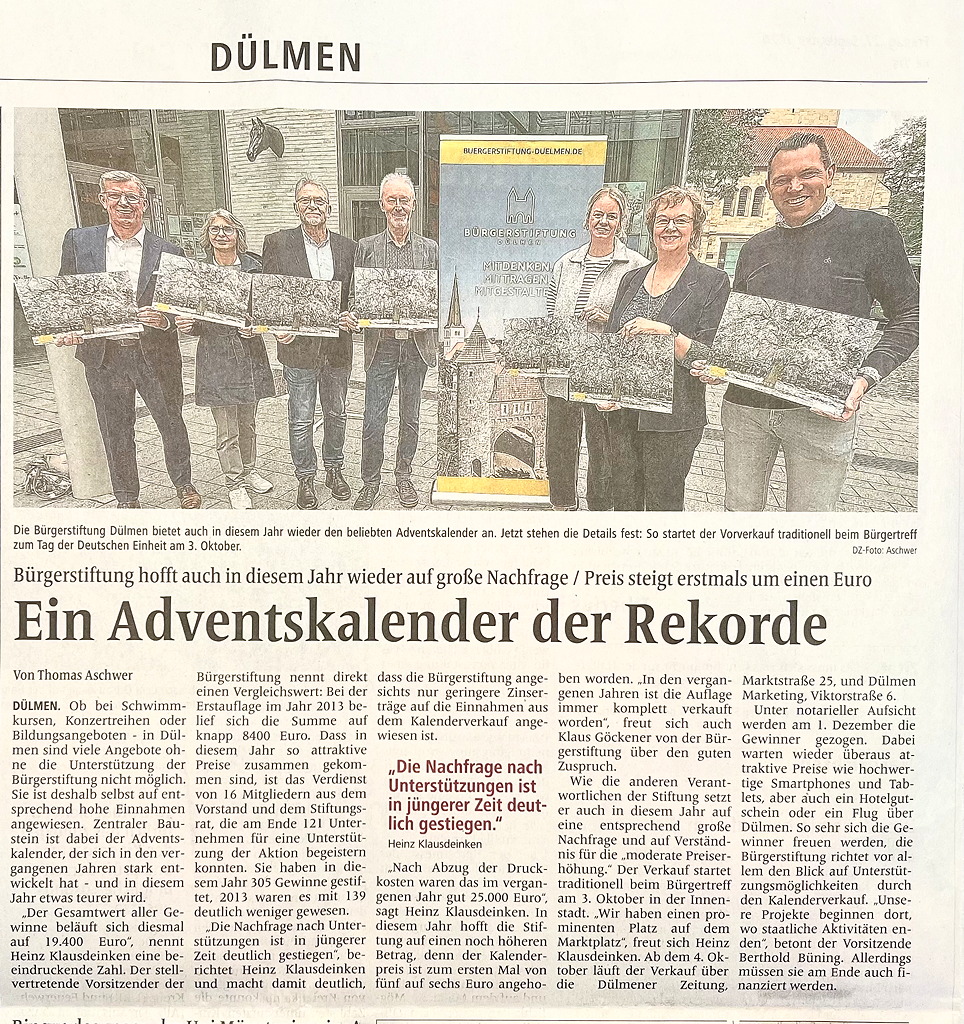 Ab Dienstag, dem 03. Oktober, kann man ihn zunächst beim Bürgertreff auf dem Marktplatz, später (ab dem 04. Oktober 2024) bei der DZ und bei Dülmen Marketing erwerben.