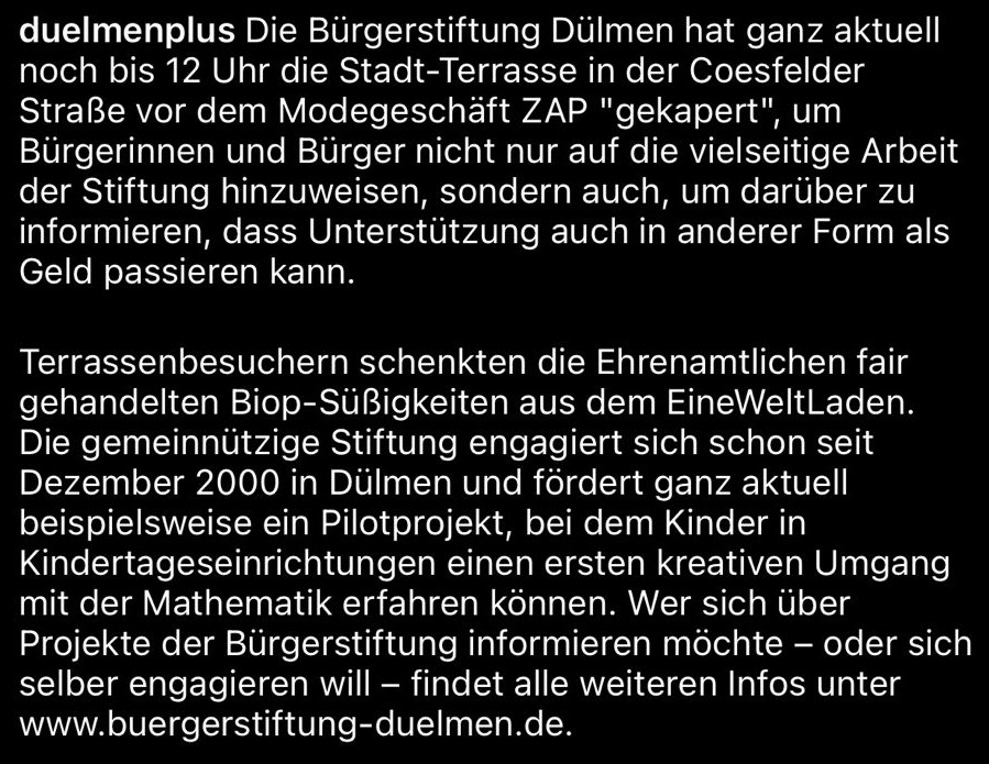 Am 14. Mai waren sie an der Coesfelder Straße präsent und kamen mit Bürgerinnen und Bürgern ins Gespräch. Es ging überwiegend darum, die Arbeit der Bürgerstiftung bekannter zu machen und gleichzeitig Rückmeldungen aus der Bevölkerung zu erhalten, wie bekannt die Stiftung ist und wie sie wahrgenommen wird. Etwas Süßes aus dem EineWeltLaden gab es dann auch noch.