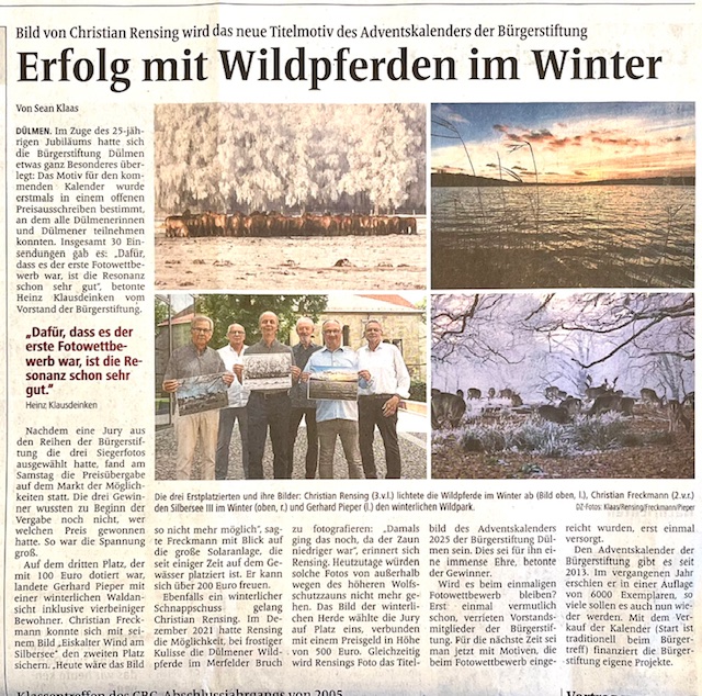 Platz eins ging an Christian Rensing. Sein Bild, das damit Titelmotiv des Kalenders 2025 wird, zeigt die Wildpferde-Herde im Winter. Rensing kann sich über 500 Euro Preisgeld freuen - und verriet, dass ein solches Foto heute gar nicht mehr möglich sei. Warum, das lesen Sie in der DZ von Montag.
