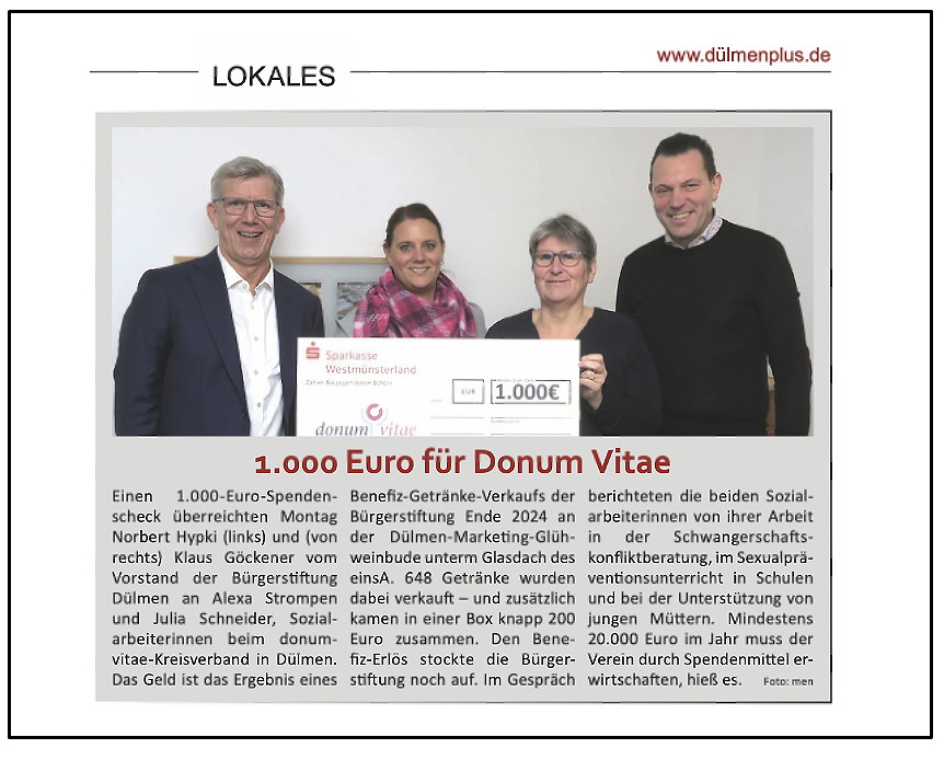 Mitglieder des Vorstands und des Stiftungsrat verkaufen Glühwein und andere Getränke für den guten Zweck. In diesem Fall kommen 1000 € durch den Erlös aus dem Verkauf zusammen, die als Spende an Donum Vitae in Dülmen überreicht werden.