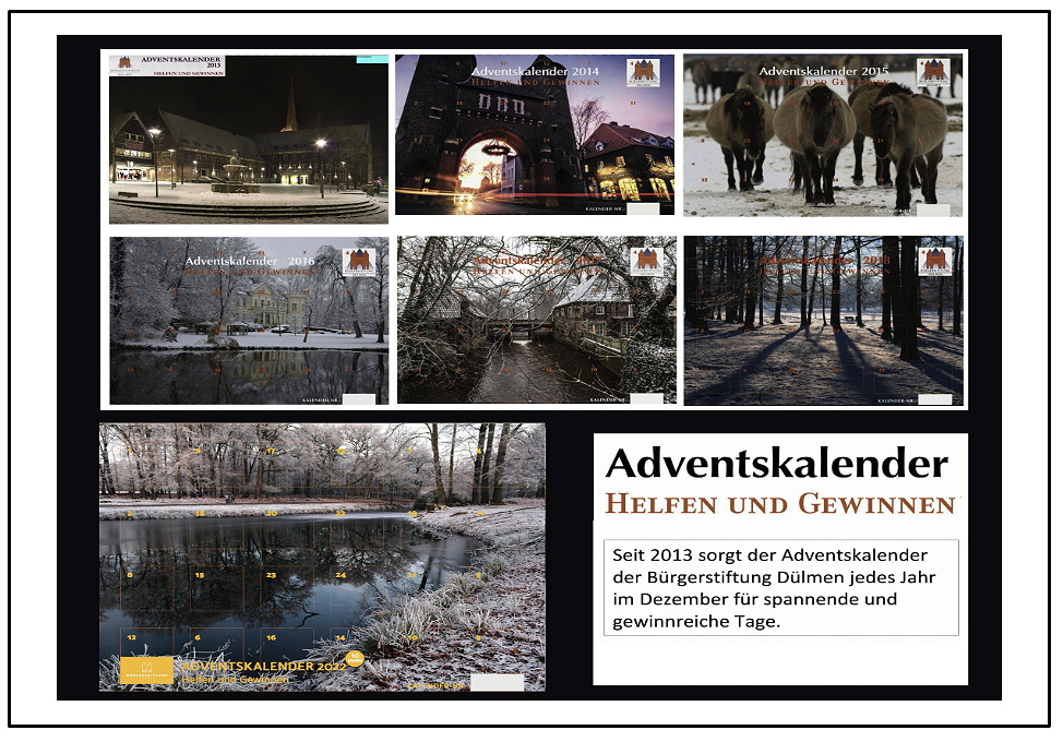 Natürlich gibt es auch im Jahr 2025 wieder einen Adventskalender der Bürgerstiftung Dülmen. Im Jubiläumsjahr der Bürgerstiftung soll es sogar ein besonderer Kalender mit neuen Highlights werden. So ist z.B. geplant, für die Auswahl des Kalenderbildes einen Wettbewerb unter Dülmener Fotografinnen und Fotografen durchzuführen, bei dem das beste ausgewählte Bild prämiert wird und als Motiv auf der Vorderseite des Kalenders erscheinen wird.