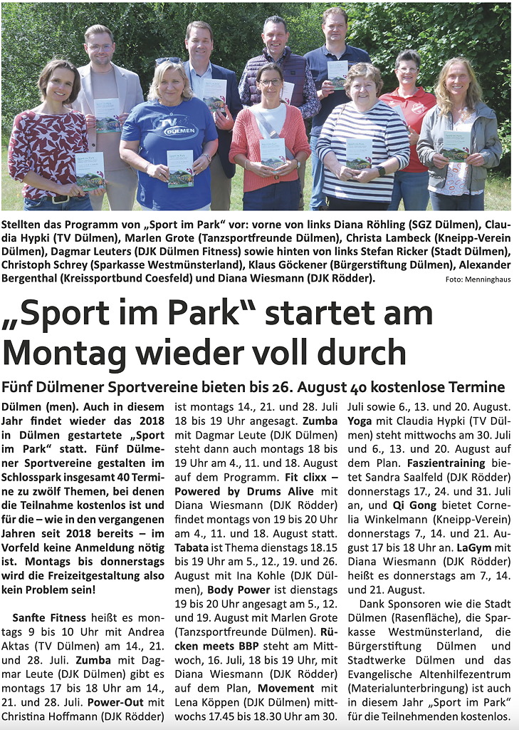 Fünf Dülmener Sportvereine bieten im Schlosspark insgesamt 40 Termine zu zwölf Themen an, bei denen die Teilnahme kostenlos ist und für die – wie in den vergangenen Jahren  –  keine Anmeldung nötig ist. Gefördert wird das Projekt u.a. durch die Bürgerstiftung Dülmen.