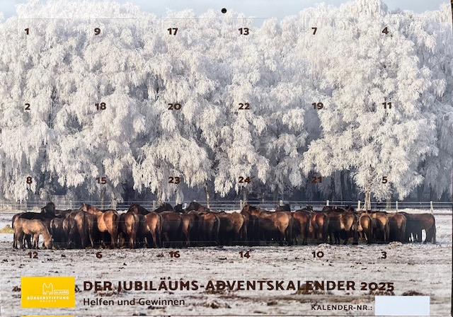 Der Gewinner des Wettbewerbs ist Christian Rensing. Sein Bild, das nun auch das Titelmotiv des Kalenders 2025 wird, zeigt die Merkender Wildpferde im Winter. Christian Rensing freut sich über 500 Euro Preisgeld. Gewonnen hat auch die Bürgerstiftung, denn nun verfügt sie über einen Bildfundus für einige weitere Adventskalender-Jahre.