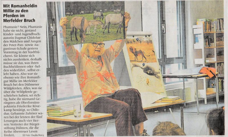 Im Rahmen der von der Stadtbücherei Dülmen und der Bürgerstiftung Dülmen gemeinsam durchgeführten Autorenlesungen fanden am 05.11. und am 06.11.2019 insgesamt 5 Veranstaltungen mit der Kinderbuchautorin Dagmar Chidolue statt. Für jeweils 70 bis 80 Schülerinnen und Schüler aus Dülmener Grundschulklassen der Jahrgangsstufen 3 und 4 las sie amüsante und spannende Geschichten aus ihren Werken, in denen unter anderem auch die Dülmener Wildpferde ihren Platz fanden. Die Autorin beantwortete auch zahlreiche Fragen der Kinder zu ihren Geschichten. So berichtete sie von zahlreichen Reisen, auf denen sie Ideen und Material für ihre Bücher suchte und recherchierte. Auch in Dülmen war sie zu Gast, um alles über die Wildpferde zu lernen, was sie in ihren Geschichten dann realitätsgetreu verwenden konnte.