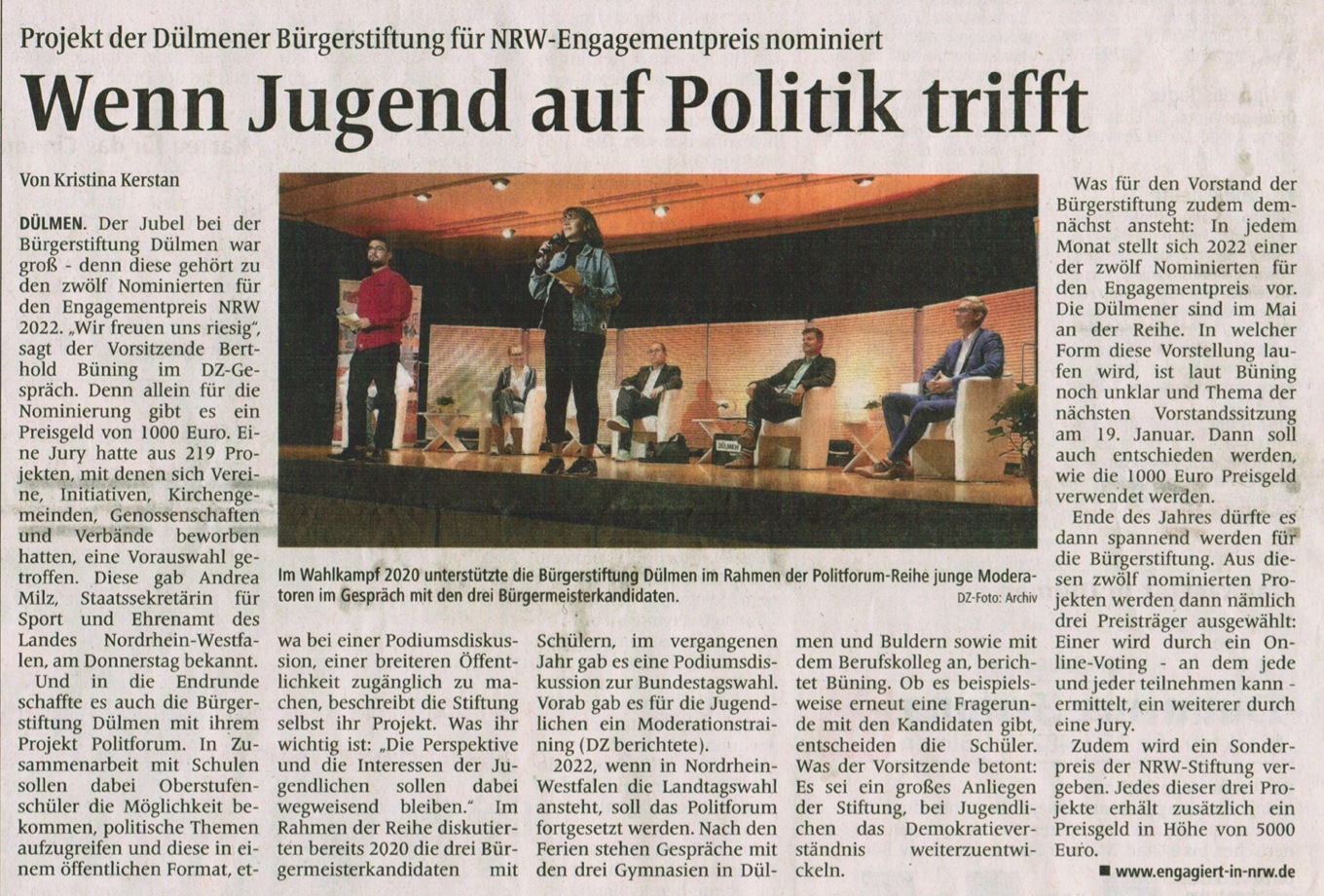 Seit mehr als zwanzig Jahren fördert die Bürgerstiftung als gemeinnütziger Zusammenschluss von Dülmener Bürgerinnen und Bürgern lokale Projekte zum Wohle der Stadt. »Wir haben es uns zur Aufgabe gemacht, eigene Ideen für die Zukunft Dülmens und ihrer Einwohnerinnen und Einwohner zu entwickeln und dabei das Engagement anderer aktiv zu fördern. Es ist aus unserer Sicht wesentlich, hierbei die jungen Menschen mitzunehmen und sie zu bestärken, ihre Perspektiven auf aktuelle Herausforderungen einzubringen. Denn es hat keinen Sinn, wenn immer die Erwachsenenwelt die Themen vorgibt «, erläutert Berthold Büning die Beweggründe für das beständige Engagement der Bürgerstiftung für Kinder- und Jugendprojekte, die Bildung und Selbstbestimmung unterstützen. Im »Politforum« können die Dülmener Jugendlichen in Gesprächen und Diskussionen eigene lebenswerte Perspektiven für ihre Generation und ihre Stadt entwerfen. Die gesammelten Erfahrungen werden, so der Wunsch der Projektbetreuer, bei möglichst vielen Jugendlichen den Grundstein für ein politisch engagiertes Leben legen.